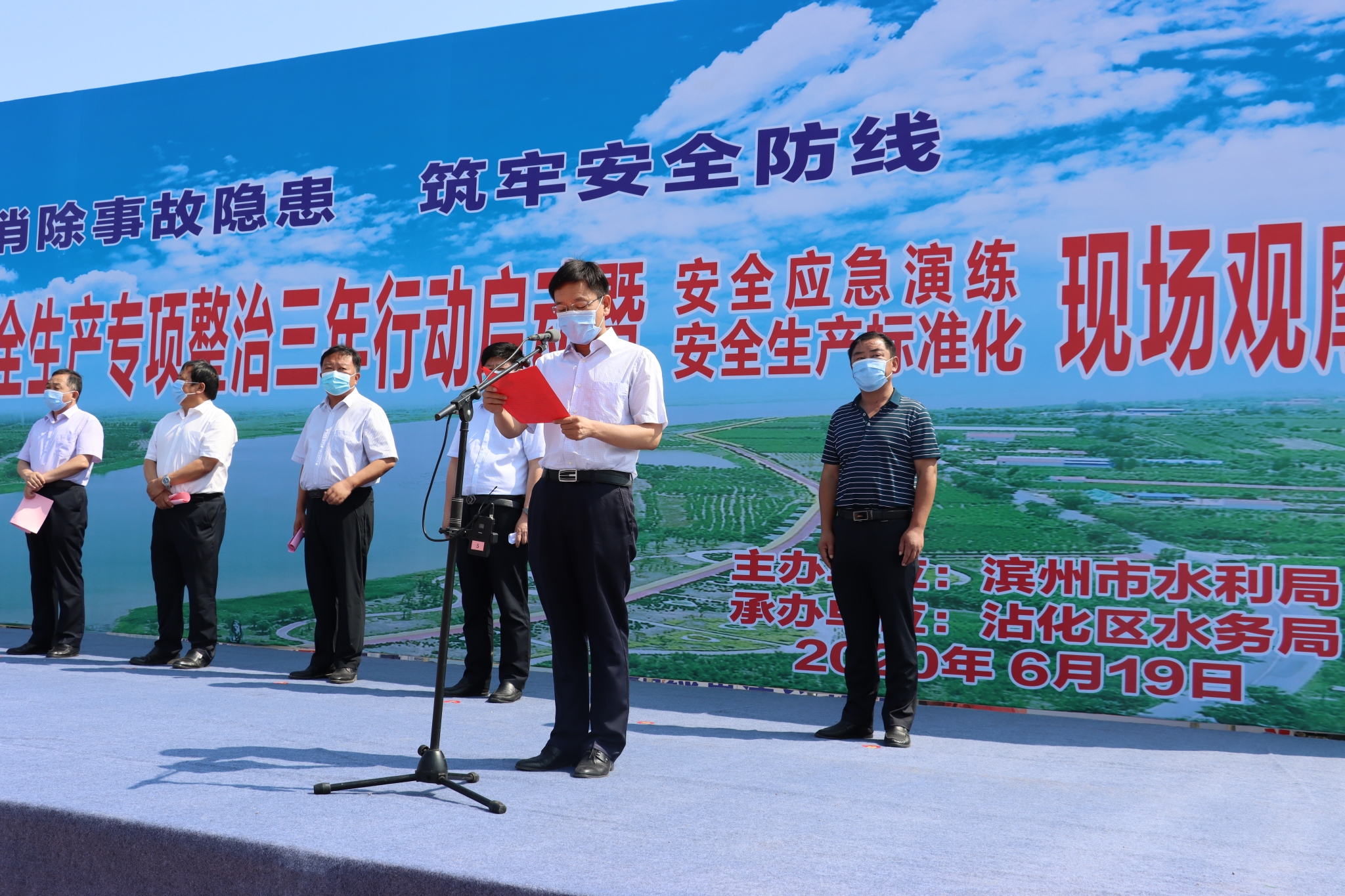 為了深入貫徹落實習(xí)近平總書記對安全生產(chǎn)的重要指示批示精神,結(jié)合全國第19個安全生產(chǎn)月,6月19日上午,2020年全市水利行業(yè)安全生產(chǎn)專項整治三年行動啟動暨安全應(yīng)急演練安全生產(chǎn)標(biāo)準(zhǔn)化現(xiàn)場觀摩會在沾化區(qū)秦口河除險加固工程安全標(biāo)準(zhǔn)化工地召開,市水利局、各縣區(qū)水利局、濱州市水利資源開發(fā)建設(shè)中心、市引黃灌溉管理服務(wù)中心、市水利工程處、市水利設(shè)計院等水利行業(yè)部門負責(zé)人共200余人參加。